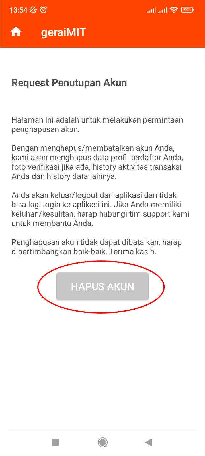 Setelah melakukan permintaan penghapusan akun, kami akan segera memproses permintaan Anda dan Anda akan keluar/logout dari aplikasi dan tidak dapat login kembali ke dalam aplikasi kami. Harap dipertimbangkan baik-baik jika ingin menghapus/membatalkan akun Anda.